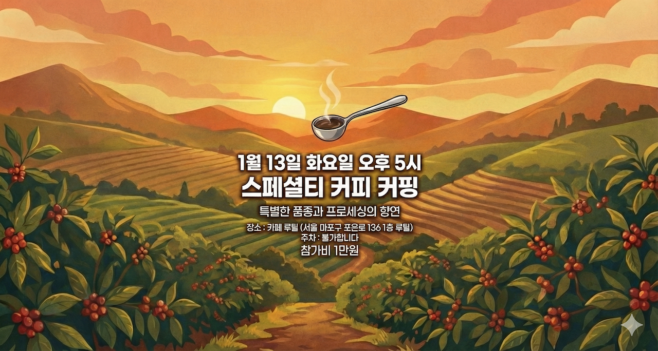 26년 첫번째 진행하는 커핑입니다. 농장소개콜롬비아 - 라 플란타 (9종) / 케브라디타스 농장 (4종) / 라 쿰파르시타 (1종) / 알데아 농장 (1종) / 라 헤렌시아 농장 (4종) / 나리뇨 시리즈 (9종) / 카우카 시리즈 (3종) / 로스 노갈레스 (2종 - 디카페인)에콰도르 - 아쿠아카테 농장 (5종) 총 38종 품종소개게이샤, 시드라, 핑크버번, 옴블리곤, 메호라도 티피카, 치로소카투라, 자바, 레드버번, 카투라 시간: 1월 13일 화요일, 오후 5시장소: 서울 마포구 포은로 136 1층 루틸 (망원동), 주차자리는 없습니다참가비: 1만원 참가신청은 구글폼으로 부탁드립니다참가신청서 링크https://docs.google.com/forms/d/e/1FAIpQLSeV46ddLbJqM69lMYURtlwnasNCBIc5ur8slv9OuugWYkGEIQ/viewform?usp=dialog 라 플란타 농장의 9종 커피리스트 가공방식은 간략하게 적었으나 각 커피마다 특별한 가공법을 적용해서 생산된 커피입니다.바로 구매가능한 커피는 "라 플란타 레인보우 게이샤" 입니다. 케브라디타스 농장의 4종 커피리스트 바로 구매가능한 커피는 "라벤더 가든 게이샤" , "판타스틱 스위" 입니다 라 헤렌시아 농장의 4종 커피리스트 바로 구매가능한 커피는 "망고"와 "블루베리&포도" 입니다. 에콰도르 엘 아쿠아카테 농장의 5종 커피리스트 알데아 농장 커피리스트 라 쿰파르시타 농장 커피리스트 나리뇨 9종 카우카 3종 로스 노갈레스 2종