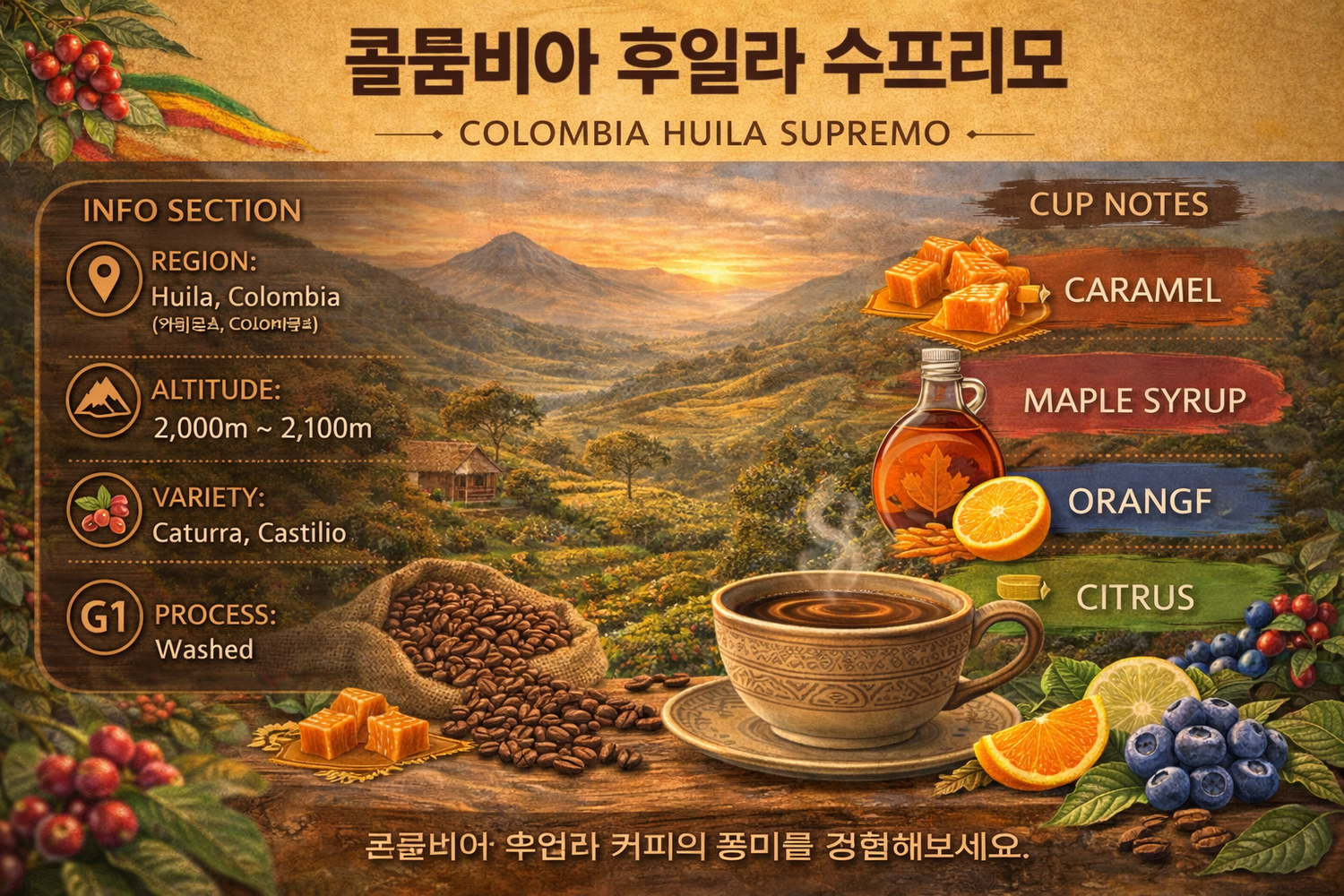 아메리카노용 원두 베이스로 가장 많이 사용되고 있는 콜롬비아 커피입니다