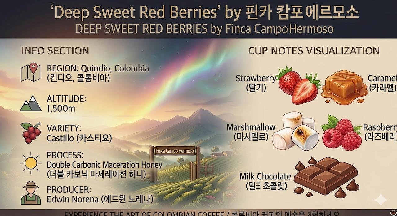 Finca Campo Hermoso는 콜롬비아 퀀디오지역의 Circasia란곳에 있는 25에이커 크기의 유명한 커피 농장입니다. Finca Campo Hermoso는 해발 1,750m ~ 1,900m에서 커피를 재배하고 있으면서 버번과 카투라 품종의 커피를 혁신적이고 다양한 실험을 하고 있습니다
