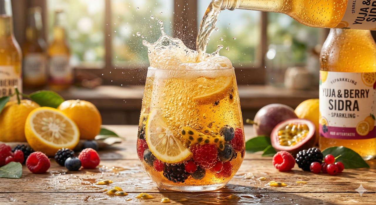 유자, 패션후르츠 같은 산미에 베리 독특한 뒷맛의 시드라 특유의 탄산같은 느낌.