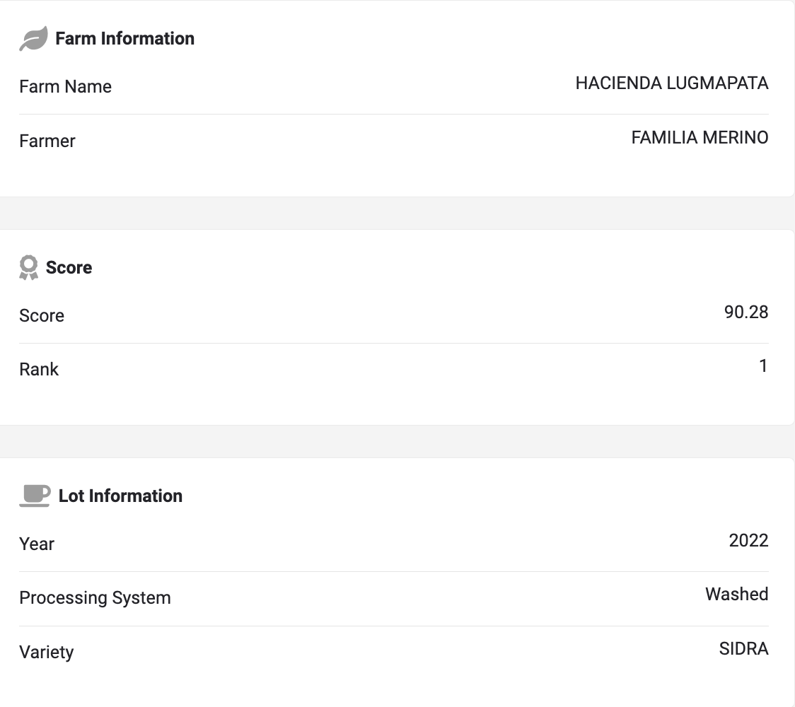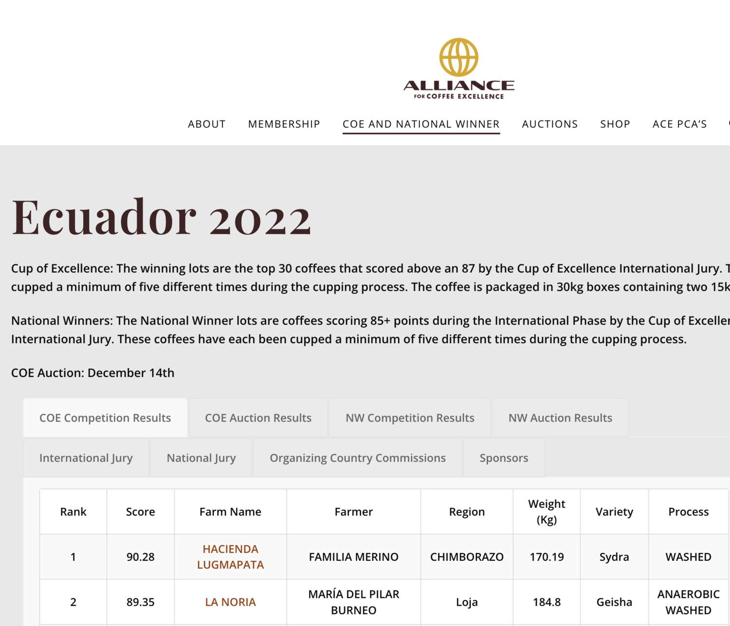 2022년 1위 - 시드라 워시드 - 90.28점 - https://farmdirectory.cupofexcellence.org/listing/1a-hacienda-lugmapata-ecuador-2022/