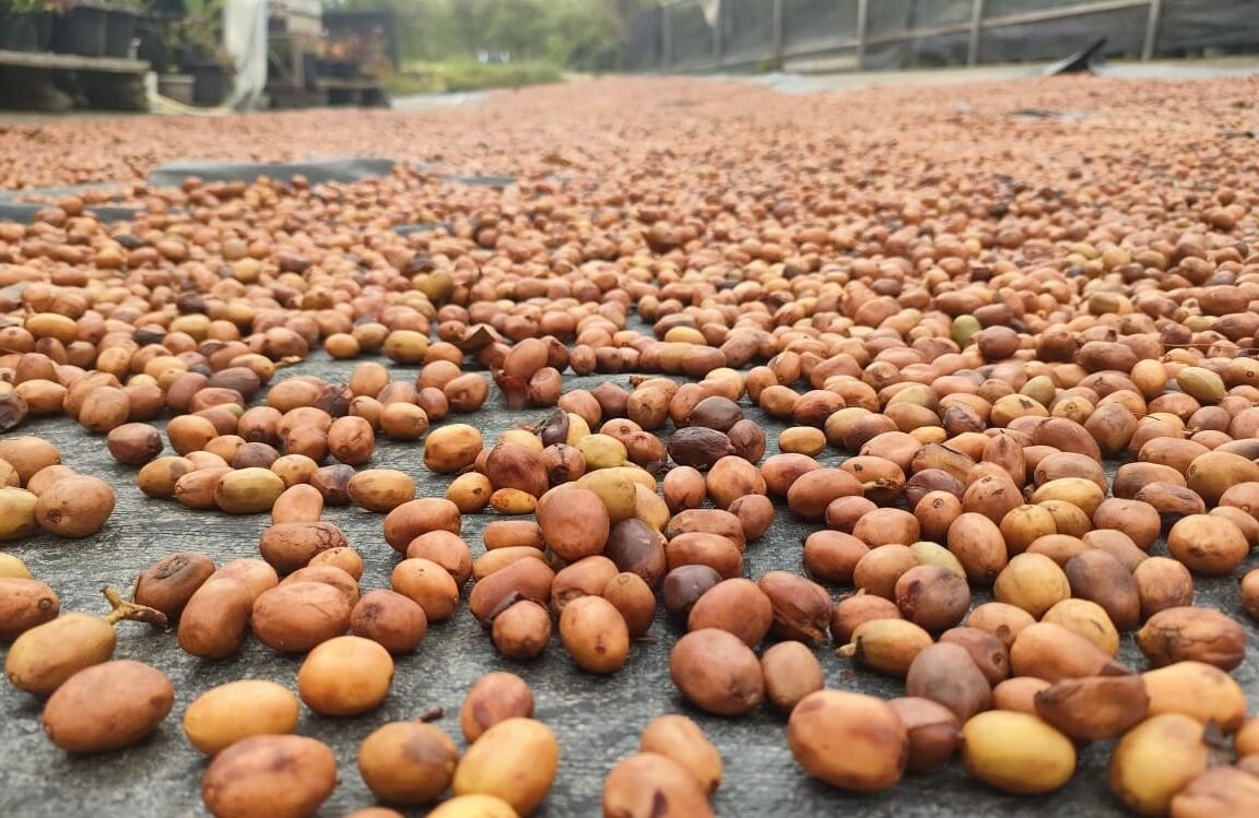 1. 수확한 커피 체리를 햇살 아래서 2시간 건조한다