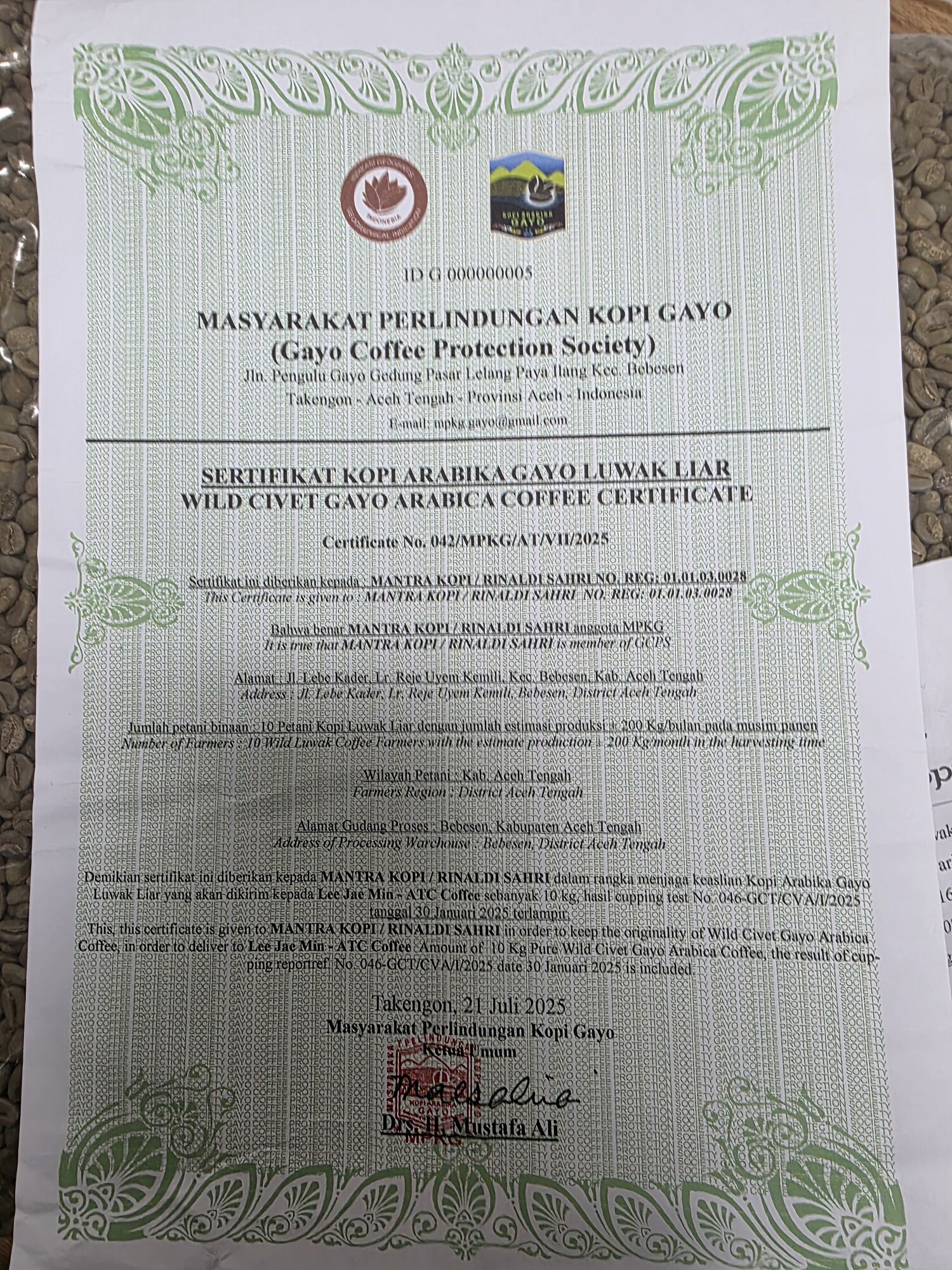 가요에서 생산된 루왁커피를 입증하는 확인서입니다