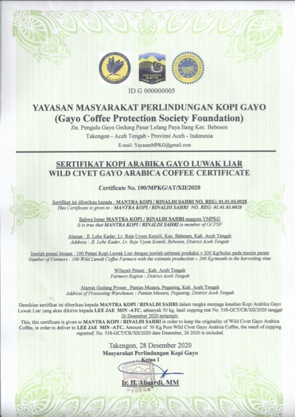 가요에서 생산된 루왁커피를 입증하는 확인서입니다