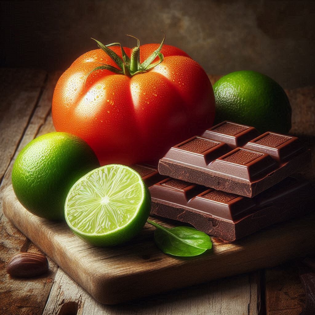 노트: 토마토, 라임,, 초콜릿