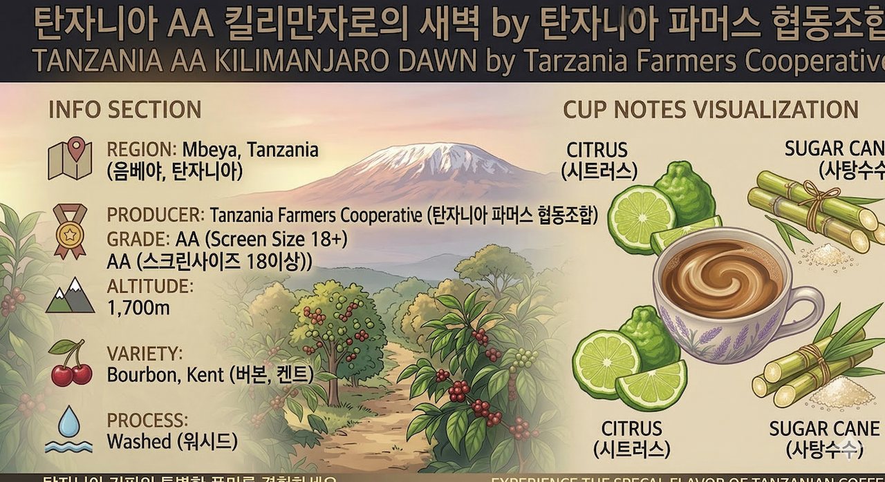Washed 가공을 통해 깨끗하게 정제된 이 생두는 여러분의 로스팅 스타일에 따라 때로는 우아한 신사처럼, 때로는 거친 야생마처럼 다양한 매력을 보여줄 것입니다. 킬리만자로의 새벽을 깨우는 생동감을 직접 경험해보세요.