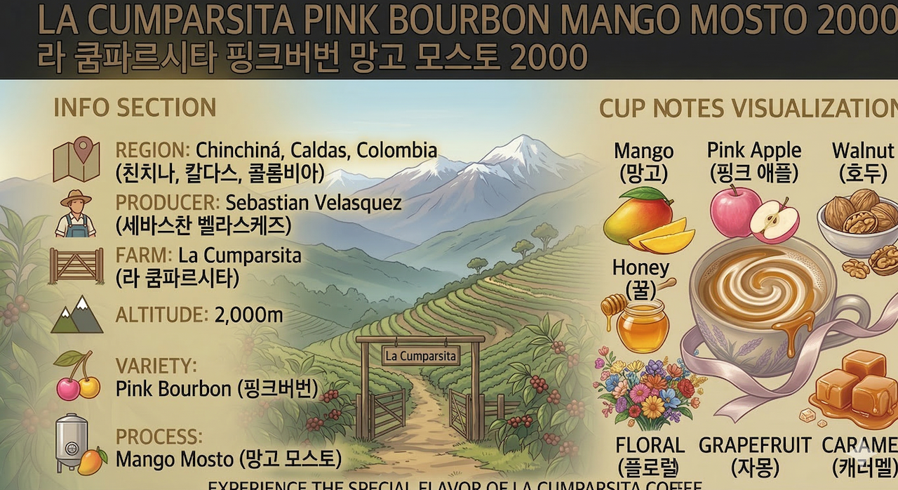 콜롬비아 칼다스(Caldas)주 친치나(Chinchiná)의 해발 2,000m 고지대에서, 새로운 콜롬비아 커피 농업의 가장 흥미로운 프로젝트 중 하나인 '라 쿰파르시타 커피'가 그 모습을 드러내고 있습니다. 젊은 농업 공학자이자 가문의 1세대 커피 농부로서 2022년 세바스티안(Sebastián)이 설립한 이 농장은, 단절되었던 전통의 회귀뿐만 아니라 스페셜티 커피의 미래를 향한 대담한 비전을 상징합니다.