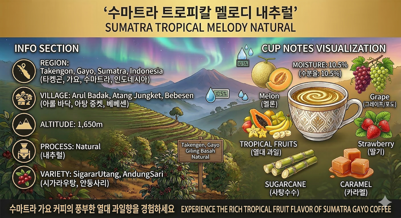 인도네시아 내추럴 커피는 쉽게 만나보기 어려운 커피입니다. 여러가지 이유가 있겠지만, 인도네시아의 변화 무쌍한 기후 환경이 큰 이유입니다. 습하고 갑자기 변화는 온도, 날씨로 내추럴 가공을 하기에는 어려운 환경입니다. 이런 어려운 조건속에서 품질좋은 내추럴 커피를 찾고 또 찾다가 만난 “수마트라 트로피칼 멜로디 내추럴”