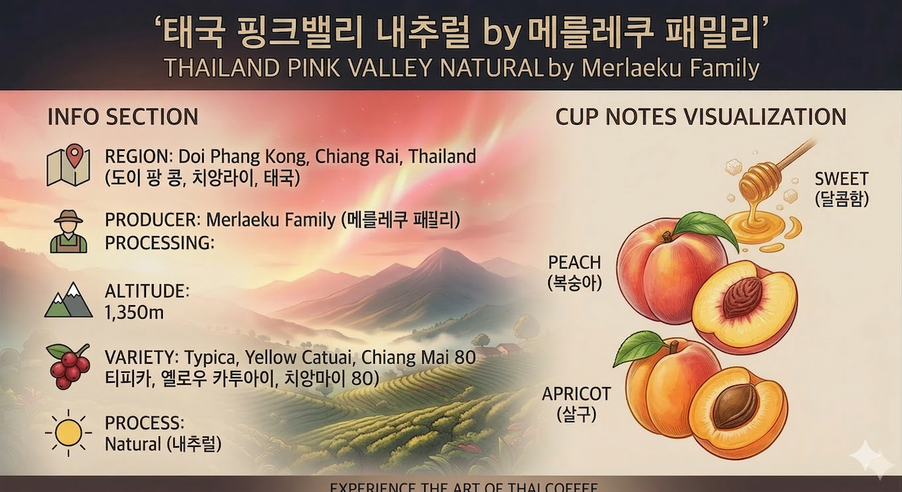 치앙라이에 위치한 커피농장을 운영하고 있는 Merlaeku 가족들에 의해 재배되고 가공한 태국의 스페셜티 커피입니다
