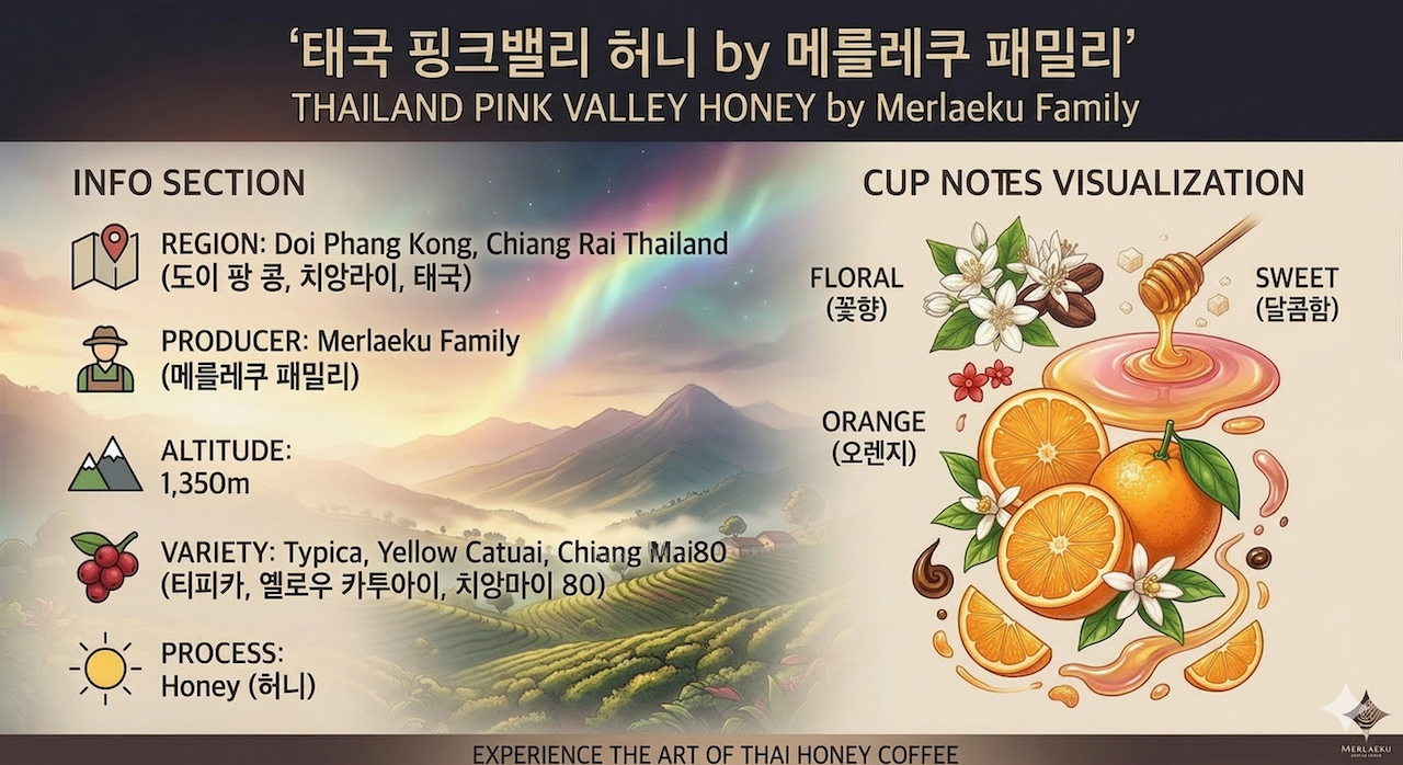 치앙라이에 위치한 커피농장을 운영하고 있는 Merlaeku 가족들에 의해 재배되고 가공한 태국의 스페셜티 커피입니다