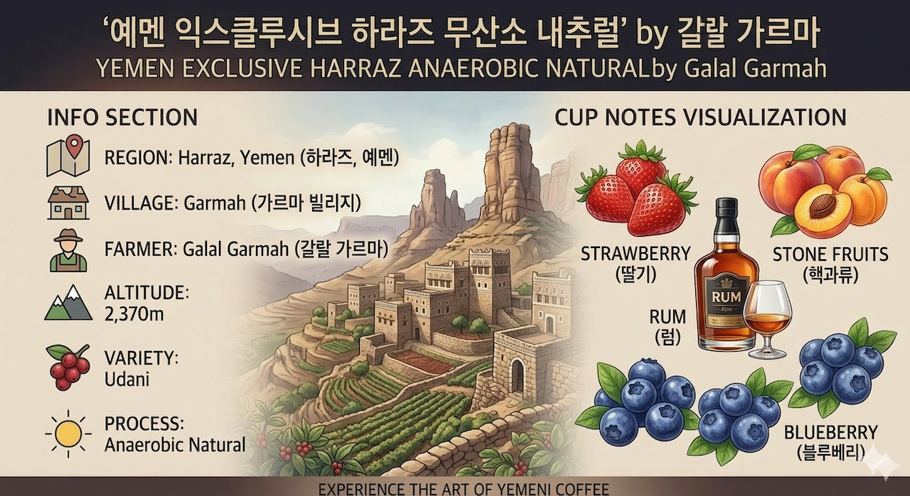 예멘 커피의 최대 생산지인 '하라즈 (Haraaz)'지역의 가장 큰 규모의 농장과 생산량을 자랑하는 업체인 'EMD Coffee'와 아시아 전체 독점 계약으로 최고 품질의 예멘 커피를 수입하고 있습니다. 하라즈 지역중에서도 최적의 커피생산 스팟에서 최고의 전문가들과 지역 농부들의 신뢰를 기반으로 생산되고 있는 커피입니다