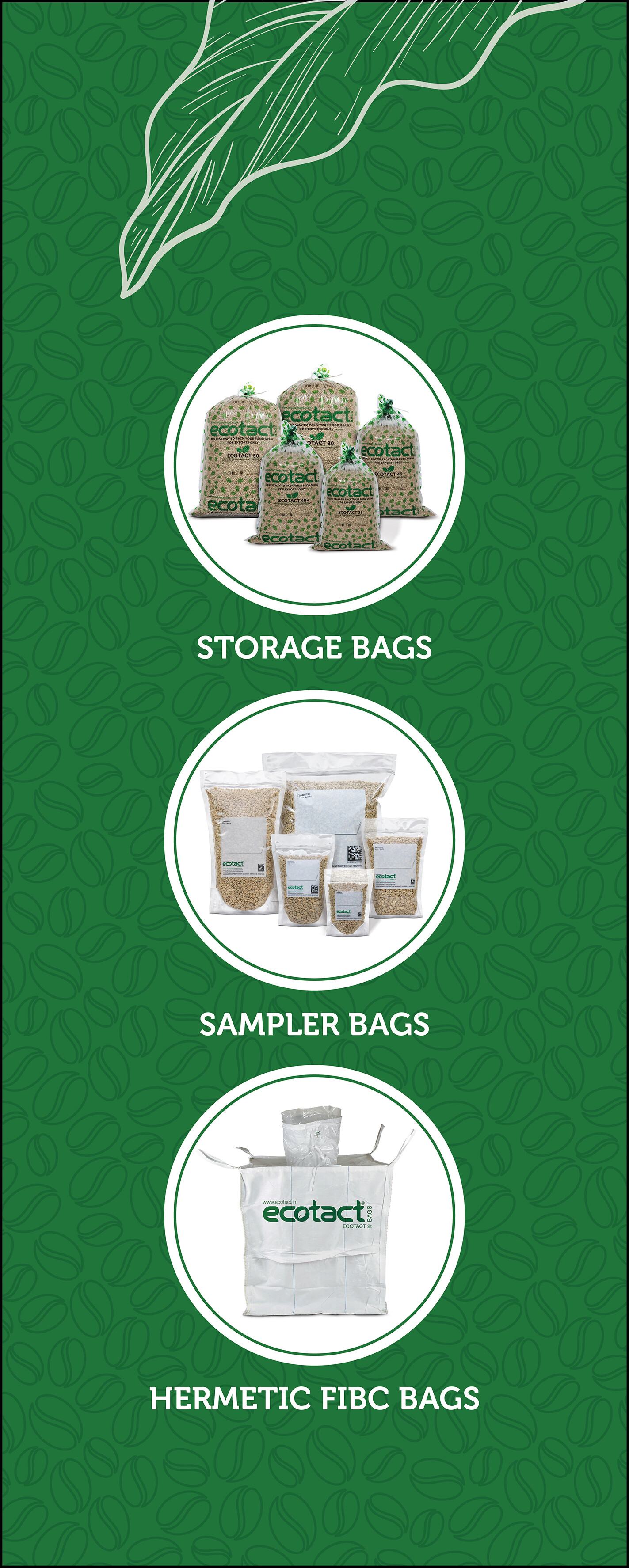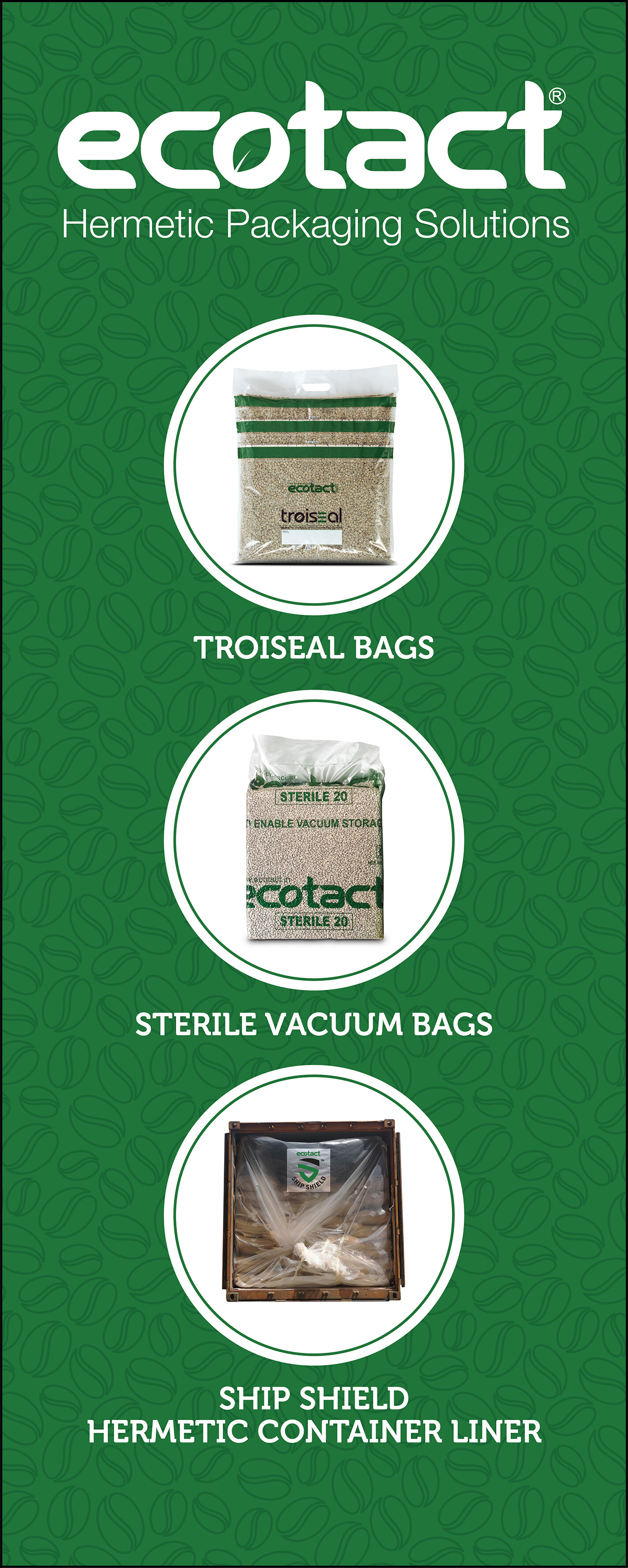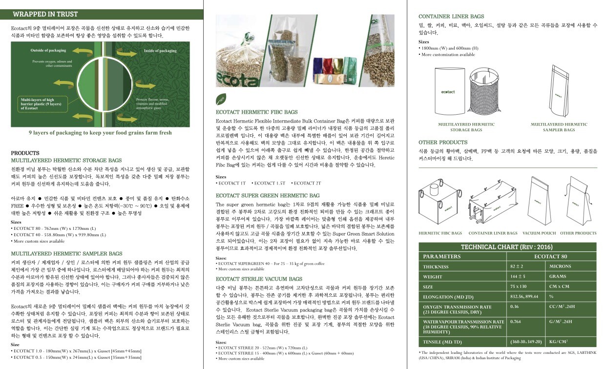 Ecotact의 새로운 9중 멀티레이어 밀폐식 샘플러 백에는 커피 원두를 마치 농장에서 갓 수확한 상태처럼 유지할 수 있습니다. 포장된 커피는 최적의 수분과 향이 보존된 상태로 로스터 및 관계자들에게 전달됩니다. 샘플러 백은 외부의 산소와 습기로부터 보호하는 역할을 합니다. 이는 간단한 실링 기계 또는 수작업으로도 정상적으로 브랜드가 필요로 하는 형태 및 컨텐츠로 포장 할 수 있습니다.