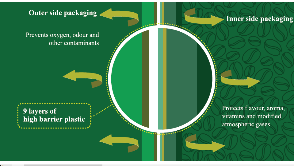 The super green hermetic bag는 1차로 9겹의 재활용 가능한 식품용 밀폐 비닐로 결합된 주 봉투와 2차로 고강도의 환경 친화적인 퇴비를 만들 수 있는 크래프트 종이 봉투로 이루어져 있습니다. 가장 바깥쪽 레이어는 맞춤형 인쇄 옵션을 제공하며 내부 봉투는 포장된 커피 원두 / 곡물을 밀폐 보호합니다. 넓은 바닥의 결합된 봉투는 보존제를 사용하지 않고도 고급 곡물 식품을 장기간 보호할 수 있는 Super Green Smart Solution 으로 되어있습니다. 이는 2차 포장이 필요가 없이 지속 가능한 바로 사용할 수 있는 봉투이므로 효과적이고 경제적이며 환경 친화적인 포장 솔루션입니다.